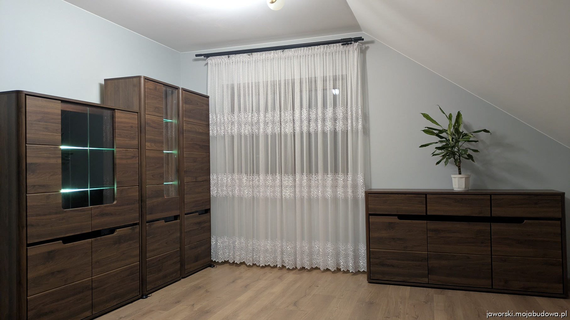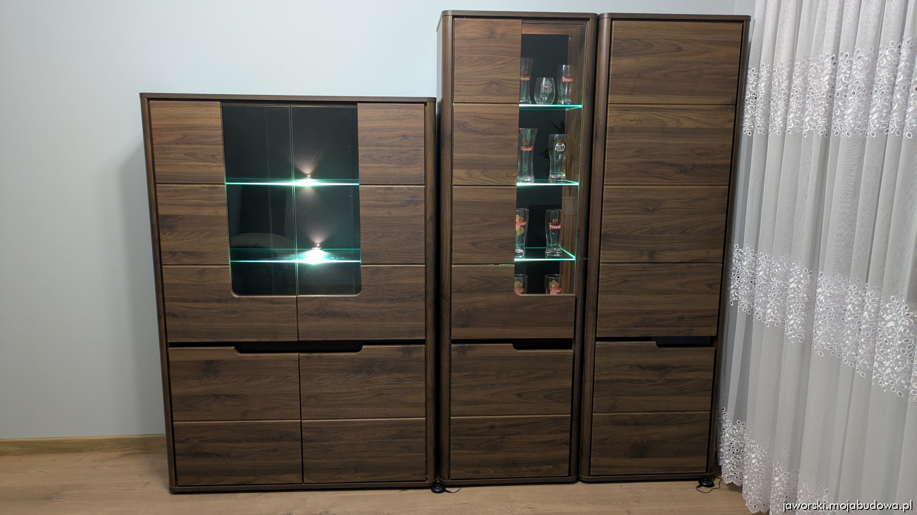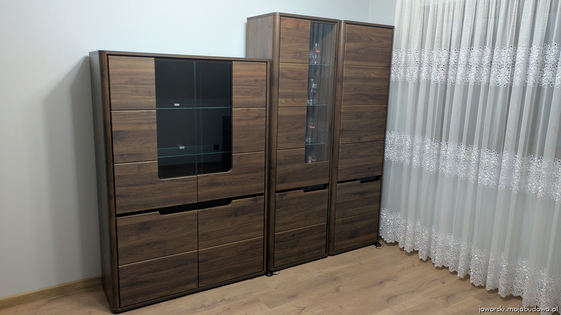 Na początku ubiegłego tygodnia kurierzy z Agaty dostarczyli zamówioną już wcześniej kolekcję mebli Porto. Niestety poprzedni zestaw Oak Square trochę nas zaskoczył słabą jakością wykonania materiałów Tym razem zapowiadało się nieco lepiej ale niestety w trakcie składania komody odkryliśmy zle wykonane otwory pod zawiasy oraz całkowity ich brak gdy chcieliśmy zamontować dwie z trzech dostępnych półek Na szczęście udało się po drobnych modyfikacjach poskładać tą komodę. Niestety to nie był koniec niemiłych niespodzianek ,a mianowicie jedna ze szklanych półek do niskiej witryny była pęknięta i nie nadawała się do montażu. W tym przypadku pomógł miejscowy szklarz u którego za niewielką opłatą zamówiliśmy nową.